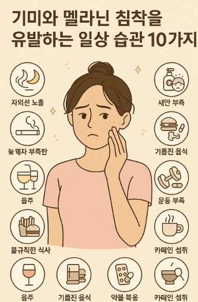 기미와 색소 침착은 내부 호르몬 변화와 면역 저하에도 밀접하게 연결됩니다. 다음과 같은 생활 패턴은 멜라닌 이상 생성에 기여할 수 있습니다.