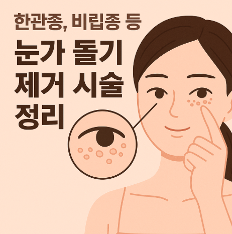 40~50대 여성에게 자주 나타나는 눈가의 오돌토돌한 돌기는 단순한 트러블이 아닌 피지선·땀샘 관련 양성 병변일 수 있습니다. 특히 대표적인 눈가 돌기인 한관종, 비립종, 지방종, 피지샘 증식은 각기 다른 원인과 형태를 가지고 있어, 시술 방법과 관리법이 달라집니다. 본 글에서는 눈가 돌기의 종류별 특징, 진단, 시술 방법, 주의사항을 항목별로 정리해 안내합니다.